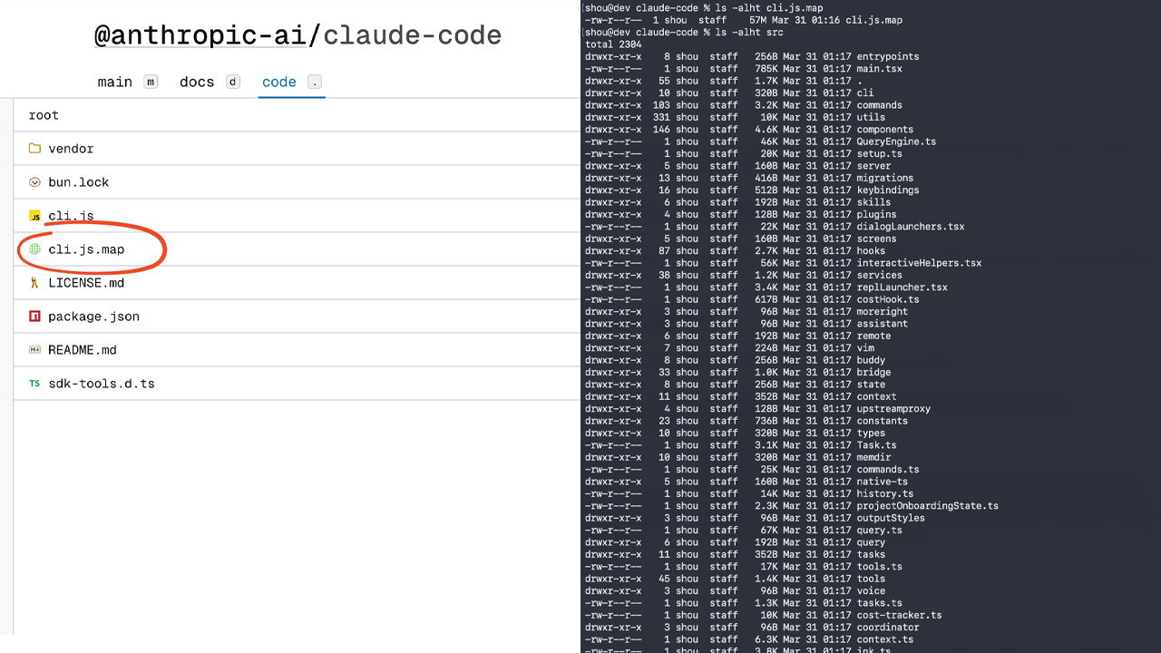 真正讓社群炸鍋的,是 Claude Code npm 套件 v2.1.88 的發布。由於打包流程出現疏忽,一個 59.8 MB 的 Source Map 檔案被一併釋出。資安研究人員 @Fried_rice 隨即展示,如何透過該檔案還原出約 512,000 行、1,906 個 TypeScript 原始碼檔案。