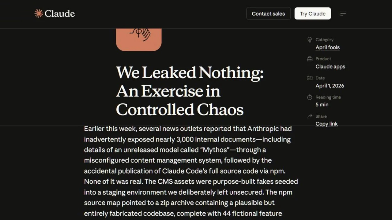 從 3 月底開始,AI 公司 Anthropic 接連傳出內部文件與核心工具 Claude Code 原始碼外洩,引發全球開發者瘋狂挖寶。然而,就在外界質疑其資安防線時,一篇名為〈We Leaked Nothing〉的文章在 4 月 1 日於社群流傳,將整起事件描述為一場「受控混亂」的演練。