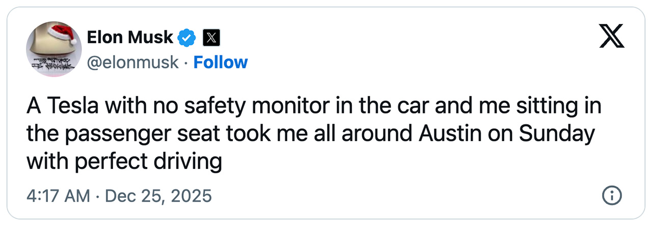 隨後在 12 月下旬,測試進一步轉為「車內有乘客但前座完全無人」的行駛情境,乘客多坐在後座拍攝影片,前排未配置任何安全員。12 月 24 日,Elon Musk 坐在副駕駛座完成一趟實測行程,而 Ashok Elluswamy 則在另一趟測試中於後座記錄畫面,兩人分別分享各自的體驗成果。