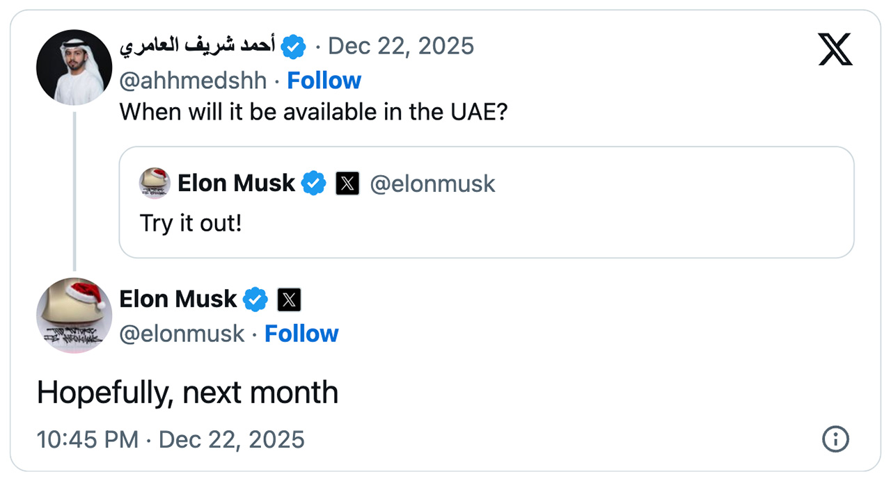 會談後隔日(2025 年 12 月 22 日),Elon Musk 在 X 平台回應阿聯當地科技分析師提問時表示,希望 FSD 能在「下個月」於 UAE 上線。若依此推算,最快可能落在 2026 年 1 月,時間點極具指標意義。