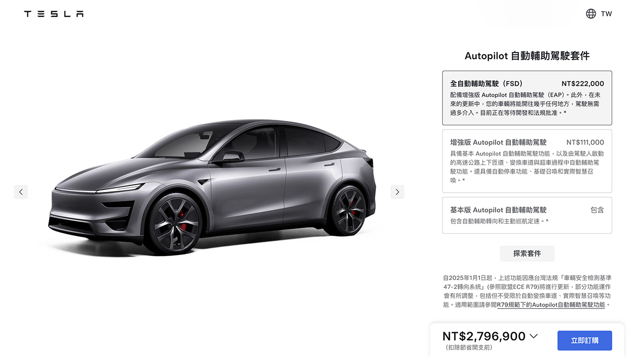 目前公告主要針對北美市場,台灣官網尚未同步揭露相同政策。台灣目前仍僅提供買斷制(約新台幣 22.2 萬元),亦未開放訂閱。但考量全球策略方向趨同,預期將逐步比照調整。