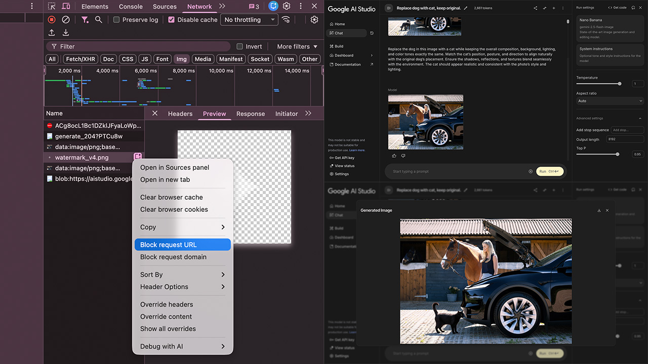),再將其疊加至圖片上。因此,只要在生成前封鎖該資源,就能輸出乾淨、無浮水印的圖片。