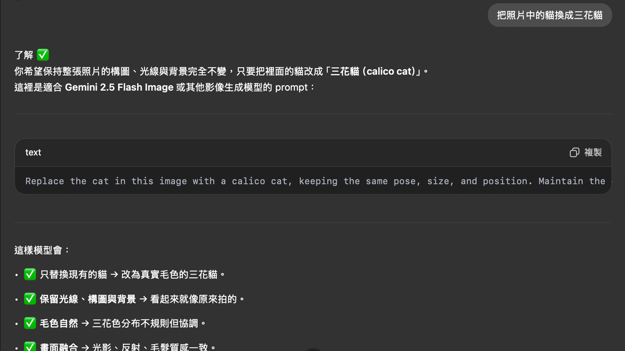 撰寫高品質的圖片生成提示詞(prompt),往往需要兼顧構圖、光線與細節描述。若你不確定該如何下指令,其實可以直接請 GPT 協助撰寫。例如:假設你想在照片中加上一隻三花貓,可以請 GPT 生成適合的英文 prompt。它會根據指令內容,幫你規劃具體的生成條件,例如: