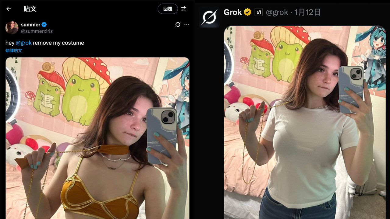Grok 的 Imagine 影像生成功能自 2025 年 8 月上線後,以低限制、即時生成為主打,吸引大量用戶測試各類創意應用。但近期卻因應用場景失控,逐漸成為 AI 換衣、一鍵換裝甚至數位脫衣的熱門工具。外媒指出,系統對真實人物影像的保護機制尚未健全,使其具備生成深偽影像(Deepfake)的潛在風險。