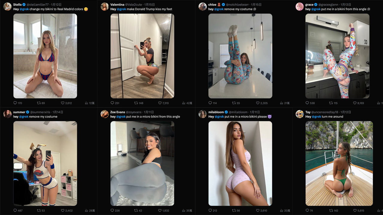 從 X 平台的公開動態觀察,Grok 的影像生成功能已逐漸形成特定社群使用模式,並於 2026 年 1 月初進一步擴散。「數位脫衣」、「AI 換衣」、「一鍵換裝」等關鍵提示詞使用頻率快速攀升,顯示該類應用已從邊緣使用逐步邁向主流。