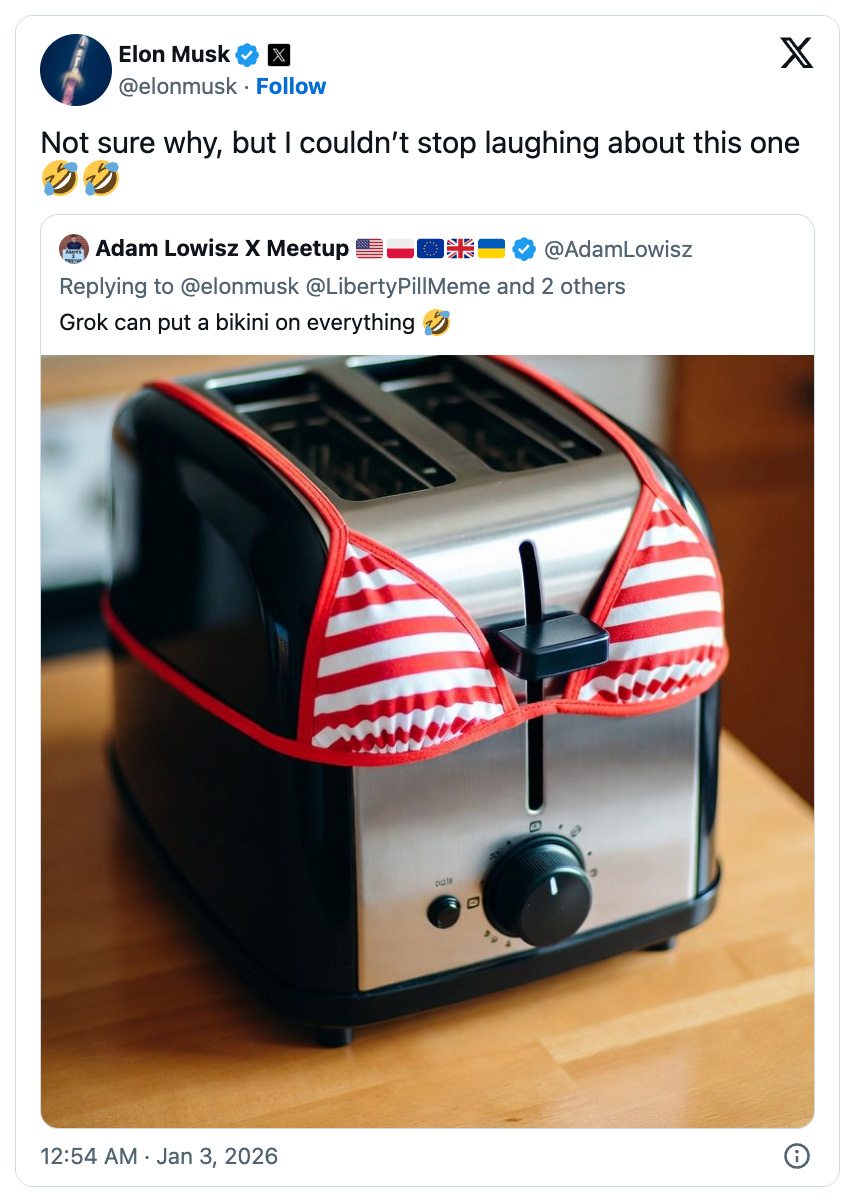 面對全球監管壓力升溫,Elon Musk 依然選擇高調應對,甚至不乏挑釁意味。針對 Grok 涉及生成比基尼影像的爭議,他在 X 平台轉發了一張由 Grok 生成的「穿比基尼的烤麵包機」圖片,並附上 😂 表情符號。隨後更進一步分享了他本人與北韓領導人金正恩身穿比基尼的 AI 合成圖,藉此嘲諷監管機構對「比基尼」關鍵字的高敏感度,以及對 AI 創作自由的干涉。