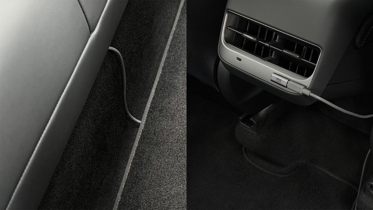 像 Model Y 除了後排 USB-C,也能使用後廂點煙器供電;Model 3 則建議使用後座 USB-C 插孔,2024 年前車型則推薦搭配 JOWUA 165W 車充。收線也不難,線材可沿後排腳踏墊走線,視覺上更整潔。