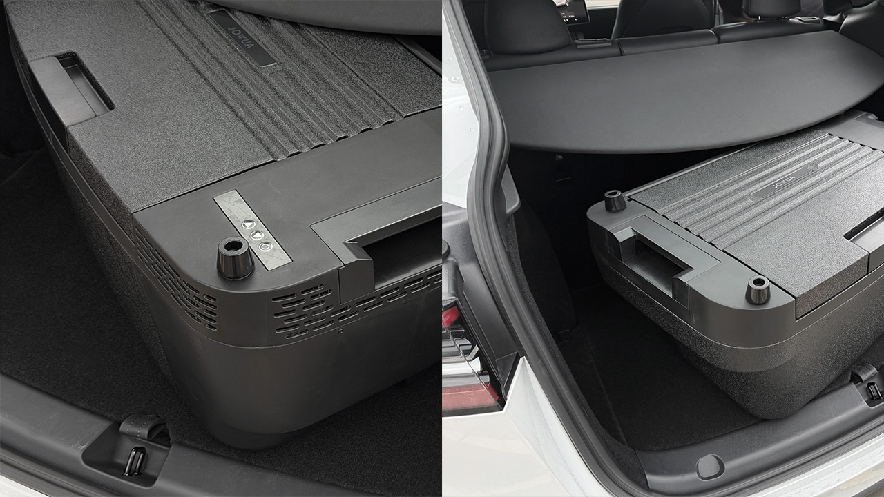 但因為熱氣從側邊與底部排出,使用時一定要保留散熱空間。建議搭配專屬通風隔板與 JOWUA 後車廂墊使用,後車廂蓋板可正常關上,冰箱上方墊可向上對折開啟,確保熱氣可順利排出,避免過熱影響效能。