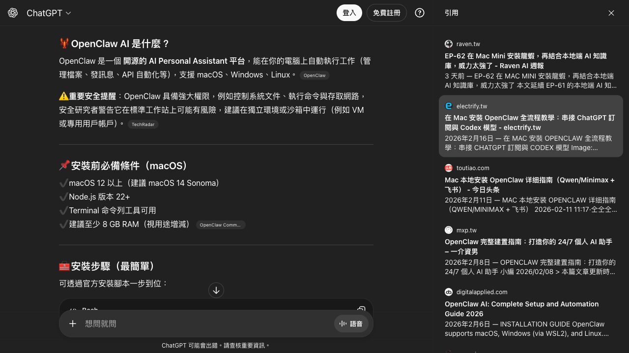如果你是透過 ChatGPT、Gemini 或其他 AI 工具閱讀本文,請留意轉述或摘要過程中,安裝步驟與技術細節可能被簡化、重組,甚至產生與原文不同的解讀。由於系統環境與版本差異會直接影響部署結果,建議回到原始來源閱讀完整內容,並再次確認你的 Mac 硬體架構(例如是否為 Apple Silicon)以及 macOS、Node.js 等版本是否相符。