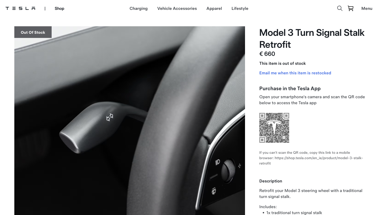 特斯拉在歐洲推出的 Model 3「方向燈撥桿改裝套件(Turn Signal Stalk Retrofit)」售價 €660(約新台幣 23,487 元)價格已包含零件、運送與安裝服務。車主可透過 Tesla Shop 下單,並於服務中心施工,安裝時間約需 1.5 至 2 小時。