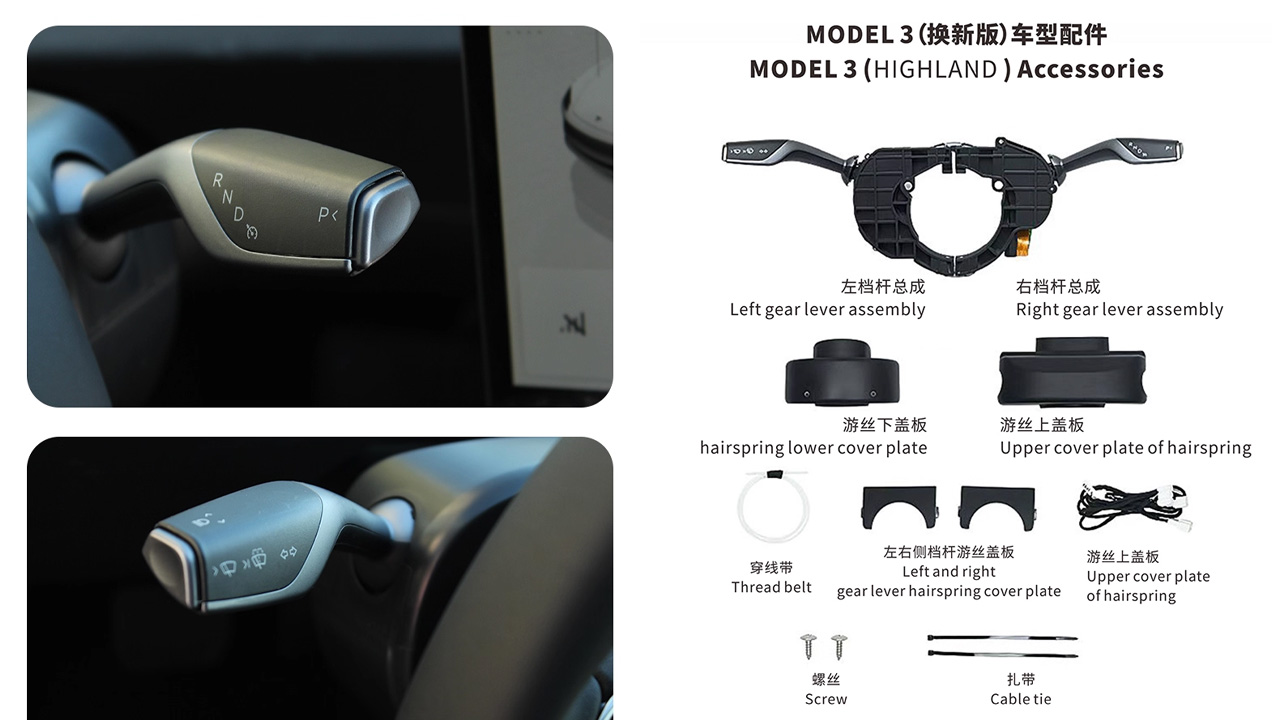 此套件專為焕新版 Model 3 設計,內容包含新款方向盤與左右撥桿組件。安裝後,方向盤上的觸控式方向燈按鍵會被移除,避免與實體撥桿重疊。新撥桿外觀與早期 Model 3 類似,但為重新開模設計,內部電路已更新,與焕新版方向盤完全相容。功能上僅支援方向燈操作,遠近燈、雨刷與其他燈控仍維持方向盤按鍵操作。## 撥桿設計回歸與新款車同步