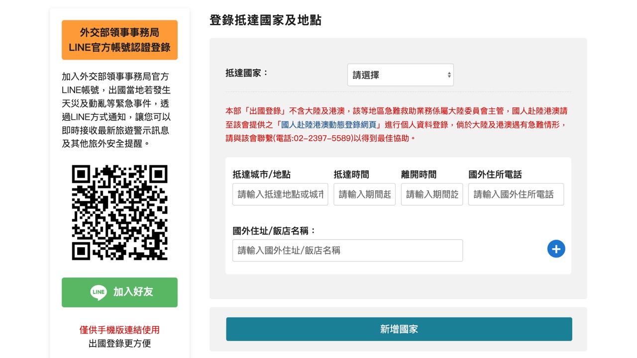 - 透過外交部領事事務局官網的「旅外國人動態登錄系統」,在出發前線上填寫資料。