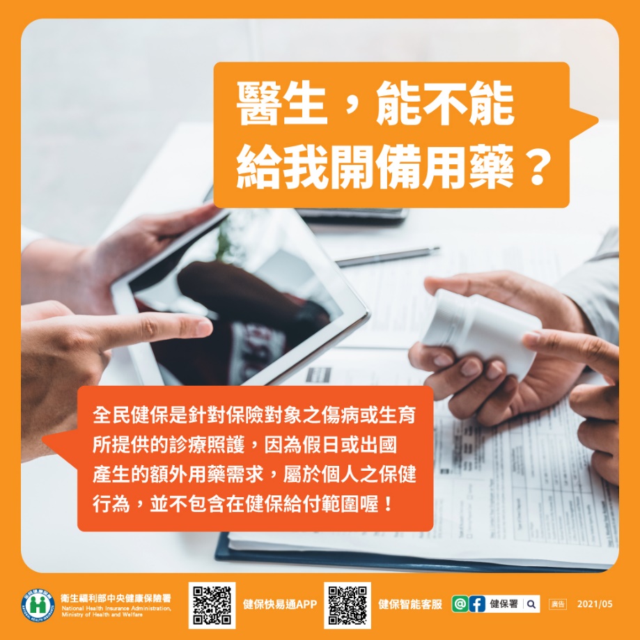 根據健保署說明,民眾若因假日或出國等需求,醫師可視情況開立備用藥物。不過這類藥品通常不屬於健保給付範圍,需自費購買,且屬於正式的醫療處方,仍需經醫師判斷後開立。
