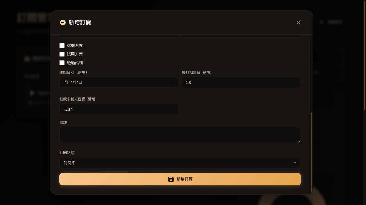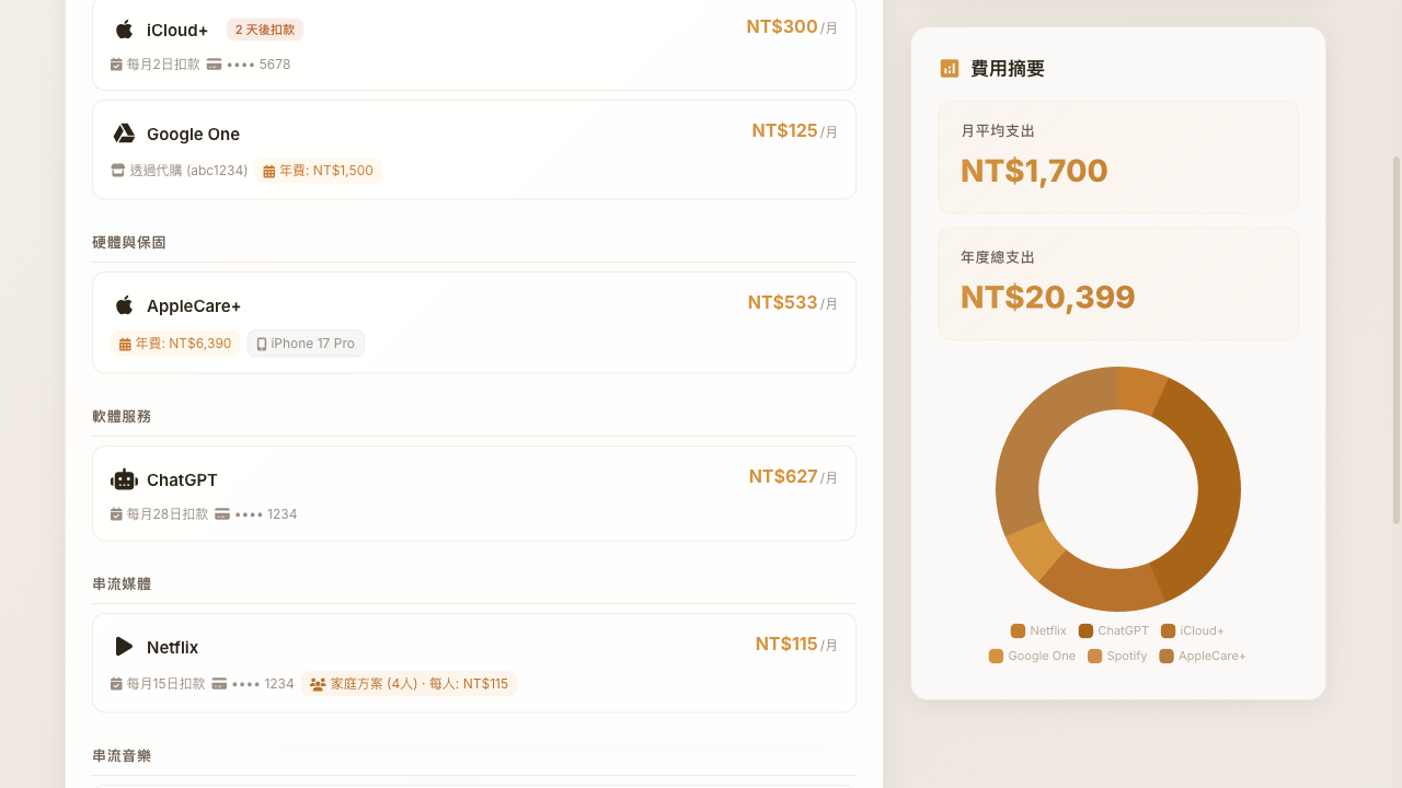 每筆訂閱皆可記錄綁定的信用卡末四碼。查看帳單時,可快速對應實際扣款的服務項目,不必逐筆翻找銀行明細。