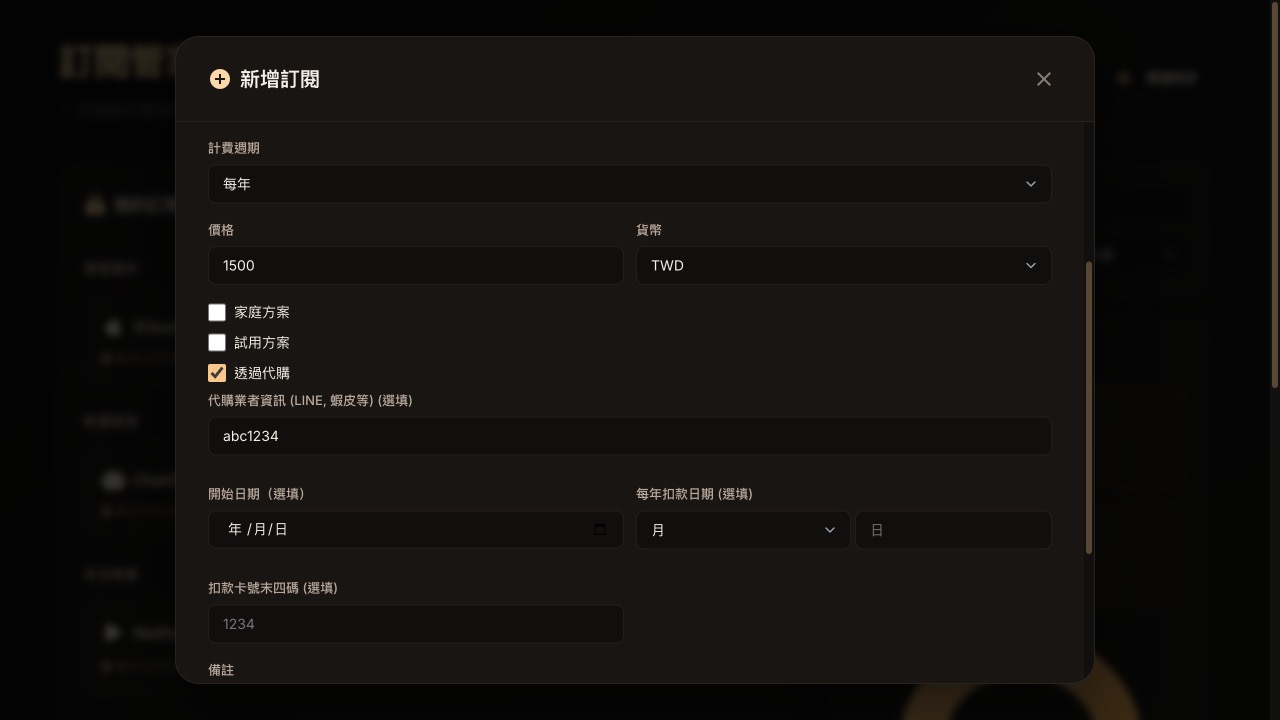 部分服務透過代購取得帳號或點數儲值,日後若需續費或臨時無法登入,往往得翻找聊天紀錄才能找到賣家資訊。訂閱管家可在該筆訂閱項目中直接記錄代購帳號或聯繫方式,於到期續費時無須再搜尋購買紀錄。