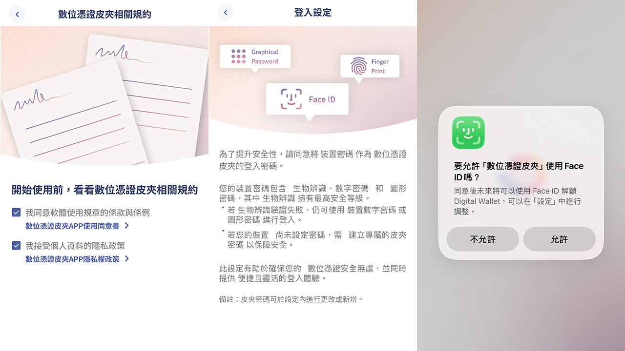 首次開啟 App 時,需依照畫面指示完成初次設定,包括同意使用條款、設定解鎖方式與確認裝置安全性。這些設定可確保憑證僅能由本人啟用,並防止他人未經授權存取資訊。