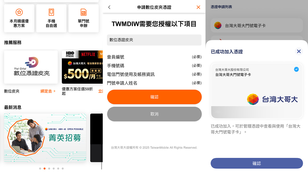以台灣大哥大為例,使用者可透過該業者 App 首頁的門號綁定專區,依指示完成驗證程序。操作時需關閉 Wi-Fi,改用行動網路連線,系統才能確認門號與裝置是否一致。驗證成功後,該門號憑證將儲存在數位憑證皮夾中。