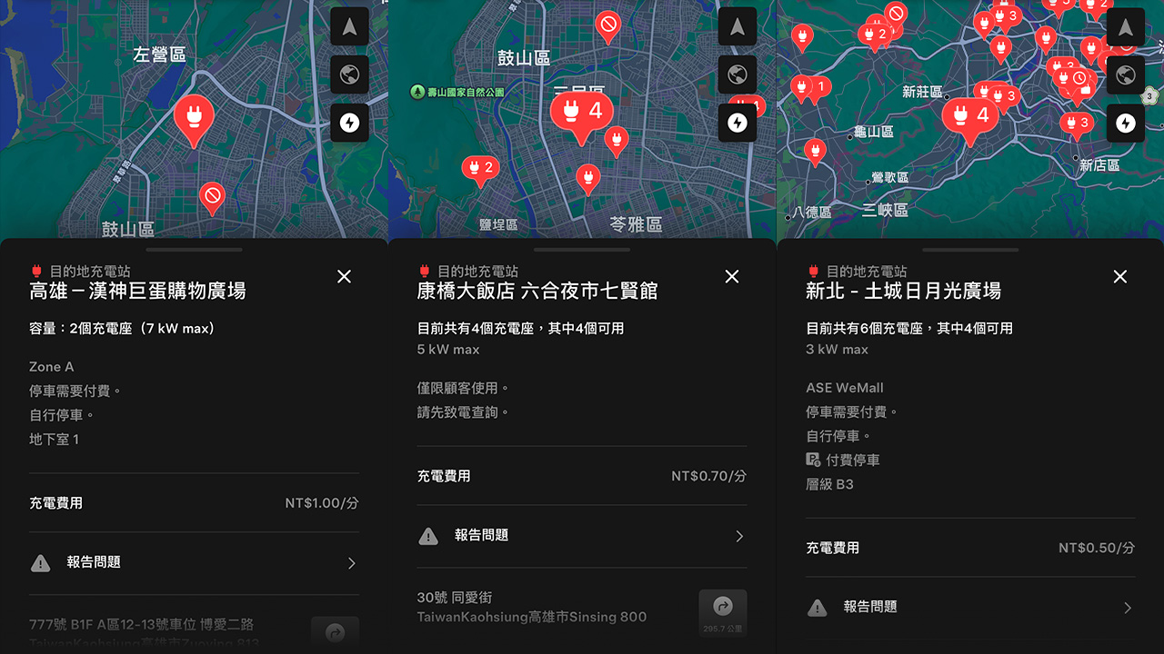 雖然主流費率為每分鐘 NT$1,但實際上部分站點仍採取彈性定價。例如高雄康橋大飯店的目的地充電費用為 NT$0.7/分鐘,新北土城日月光廣場則為 NT$0.5/分鐘,皆低於主費率標準。也有部分目的地站點在 Tesla App 上尚未標示任何費用,推測可能暫時維持免費或尚未完成系統建置。此類場站未來是否調整為統一費率,仍有待觀察。