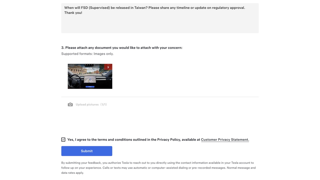ECHO 表單支援圖片上傳功能。如果是車輛故障、充電站異常或能源設備問題,附上現場照片能幫助內部更快掌握情況。提交後,系統會寄出一封確認信件,內含 ECHO 編號(ECHO Number),方便車主後續追蹤或聯繫。特斯拉目前尚未公布處理時間,也沒有保證每一筆意見都會收到人工回應。