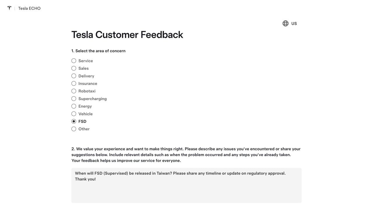 實際測試顯示,ECHO 可以用來詢問全自動駕駛系統(FSD)在台灣的導入時程與法規審查狀況。這次填寫的內容是詢問特斯拉是否能提供 FSD(包含 Supervised 與 Unsupervised 模式)在台上市的預估時間與最新審查進度。