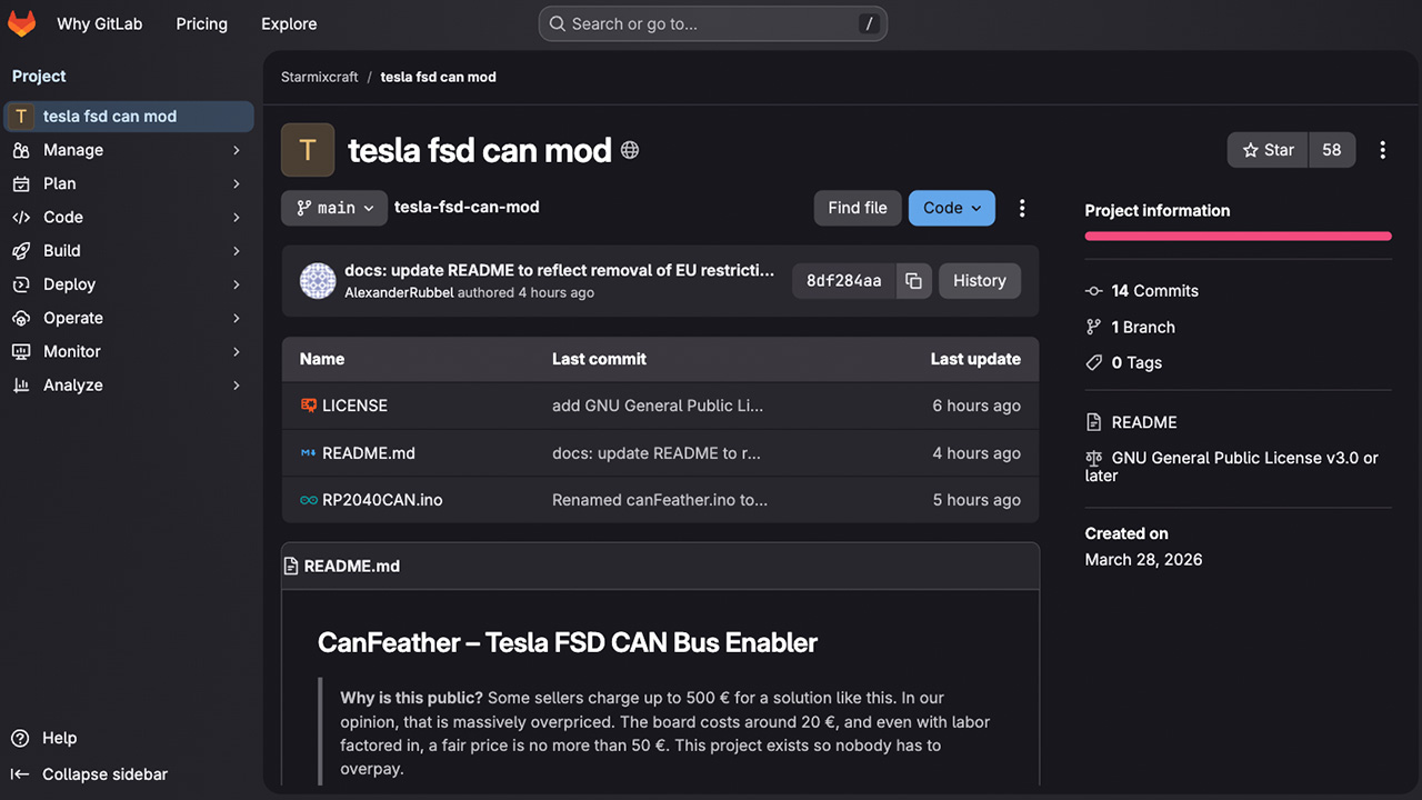 2026 年 3 月 28 日,開源平台 GitLab 上出現名為 CanFeather 的特斯拉 FSD CAN Bus 修改工具專案。該專案由開發者 Starmixcraft 發起,透過低成本開發板硬體,嘗試繞過地區限制,讓已訂閱 FSD 的車主提前啟用部分功能。