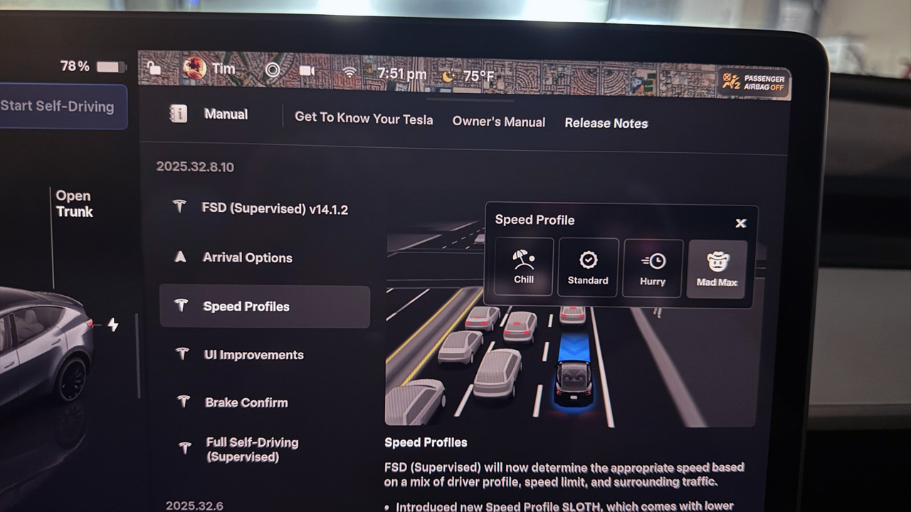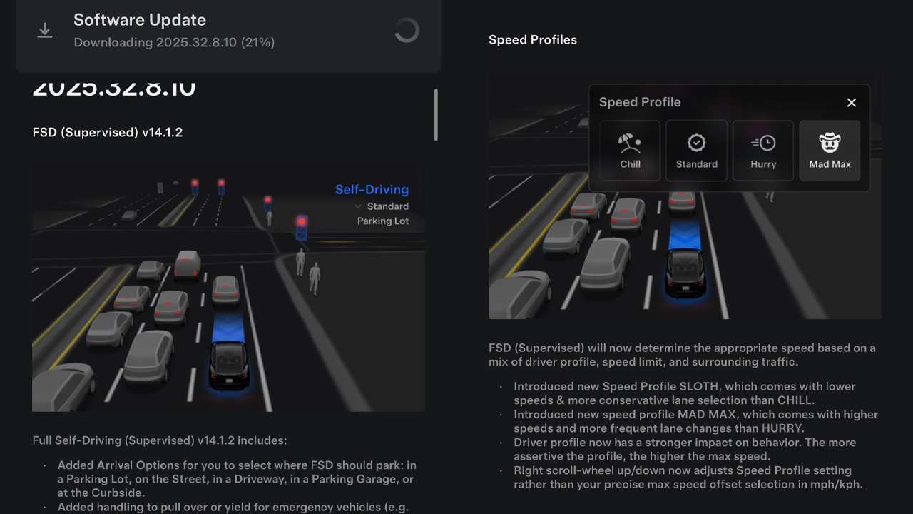 Mad Max 模式隨軟體版本 2025.32.8.10 優先推送給 Early Access Program 測試車主,預計數週內將逐步擴大至全體 FSD 車主。這次更新是特斯拉在一週內推出的第三個 FSD 版本,顯示技術開發節奏正持續加快。