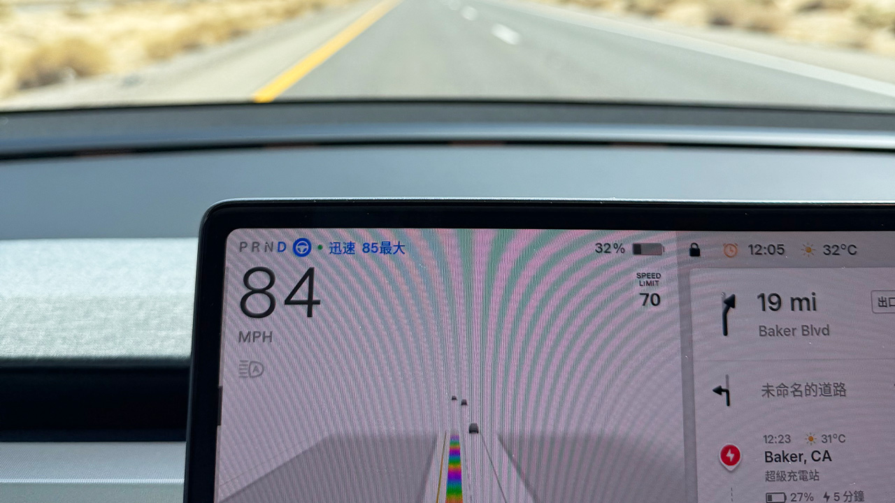 從洛杉磯好萊塢的 Tesla Diner 出發後,行程沿著州際公路一路開往拉斯維加斯。FSD 的標準模式整體偏向穩定,在市區道路上不太明顯,但上了高速公路後,由於速度適中、跟隨車流、變道次數少,整體節奏顯得稍微緩慢。