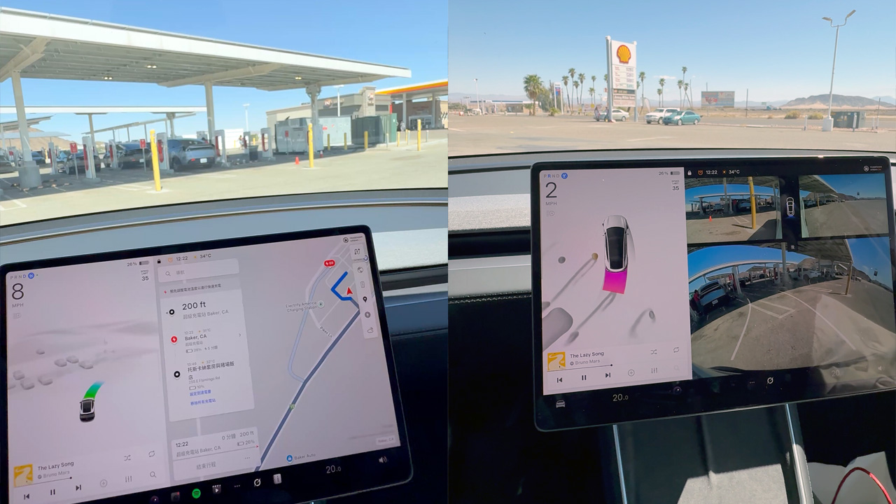這趟旅程的第一個充電停留點是 Baker 超級充電站。當 FSD 導航抵達後,車輛會嘗試自動停入充電車格,不過目前仍無法判斷哪些車位有遮陽、哪些樁位不會共享功率,這部分仍需駕駛自行判斷。