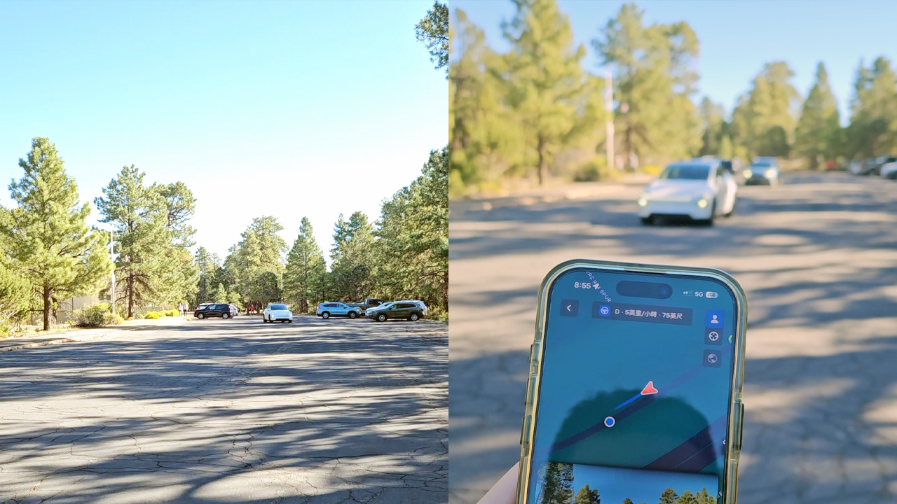 最極端的情境出現在下羚羊峽谷。前往遊客中心的最後一段是紅土下坡碎石路,既沒有護欄,也沒有標線,但 FSD 依然穩定前進,毫不猶豫,甚至能準確辨識該進入的柵門與停車區。這段表現可說是令人驚艷。