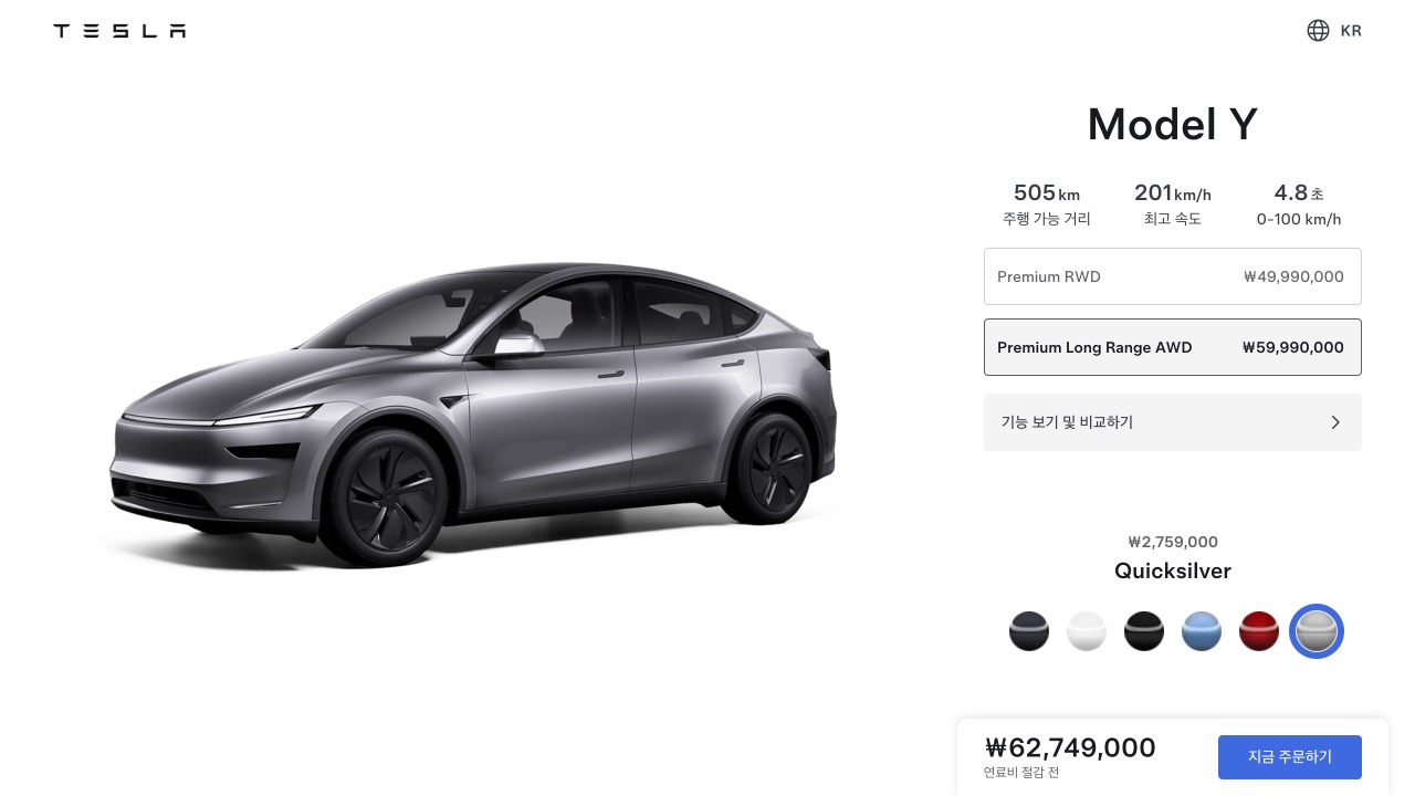 | Model Y Premium Long Range AWD | 6,314 萬韓元(約台幣 138.9 萬) | 5,999 萬韓元(約台幣 132.0 萬) | 約 315 萬韓元(約 5.0%) |