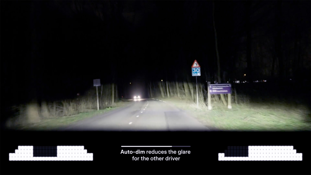 當自適應遠光燈啟用,且系統判定前方無明顯光源時,遠光燈會自動開啟;若偵測到對向車燈或其他強光來源,則會針對特定區域進行像素級調暗,以避免干擾其他用路人。功能可用性仍取決於車型年份、所在地法規與軟體版本。