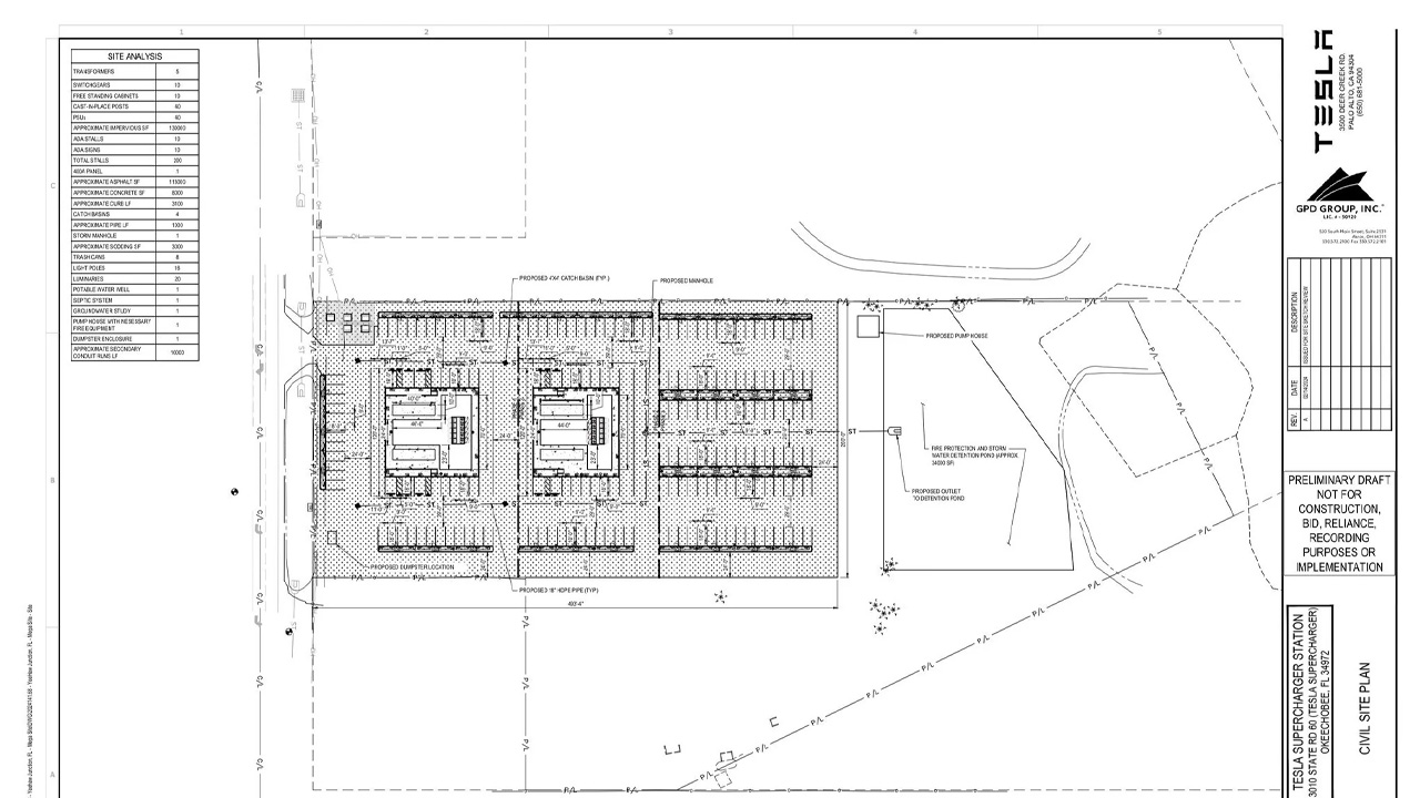 佛羅里達州 Yeehaw Junction 站點則於 2024 年首次曝光規劃,預計建置超過 200 支超級充電座,並包含多個可供拖車使用的車位。截至 2026 年 3 月,該計畫仍處於審核或基礎設施配套建設等待階段,尚未公布具體動工或啟用時間。