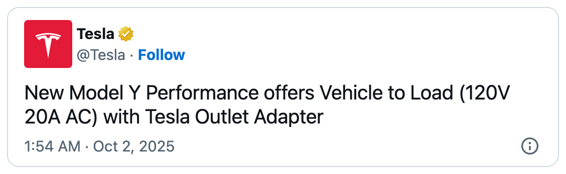特斯拉在 X 上回覆網友時確認,新款 Model Y Performance 將支援雙向充電功能,涵蓋 Vehicle to Load(V2L)與 Vehicle to Home(V2H)。在 V2L 模式下,透過專用轉接器可輸出最高 2.4 kW,能為小型裝置供電,適合露營或臨時攤位使用。