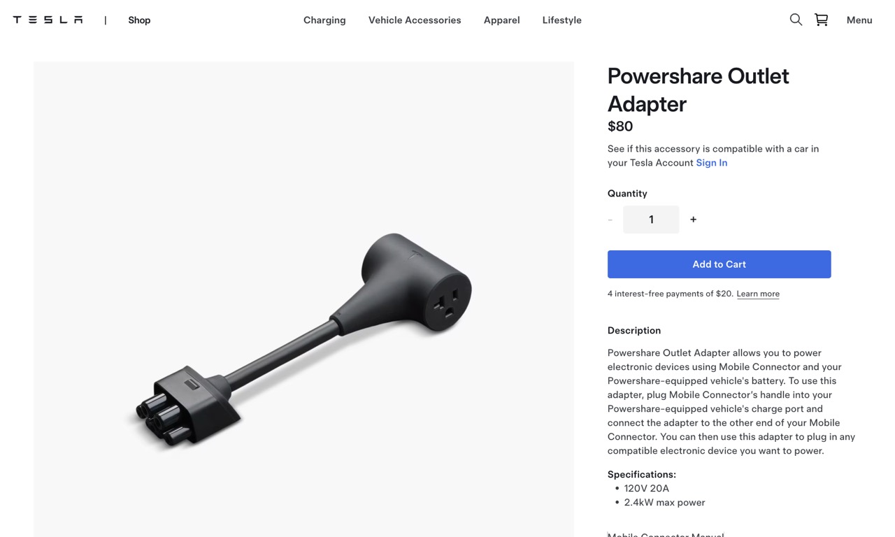新款 Model Y Performance 可透過 Tesla Powershare Outlet Adapter,將充電埠轉換為 120V 20A 插座,輸出功率最高達 2.4 kW。此設計可支援冰箱、風扇、電鍋、音響或筆記型電腦等家電,適合露營或臨時設備供電。