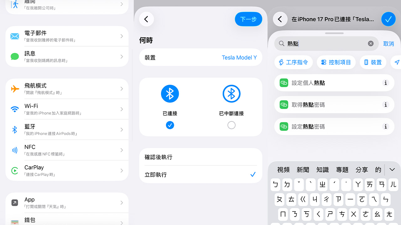 iPhone 的「個人熱點」可搭配「捷徑」中的「個人自動化」功能,透過藍牙連線觸發流程,當手機偵測到與特斯拉車內藍牙連線後,即可自動開啟熱點。配合車機的已知網路記憶功能,車輛將自動連上 Wi-Fi,無需手動操作即可取得網路連線。