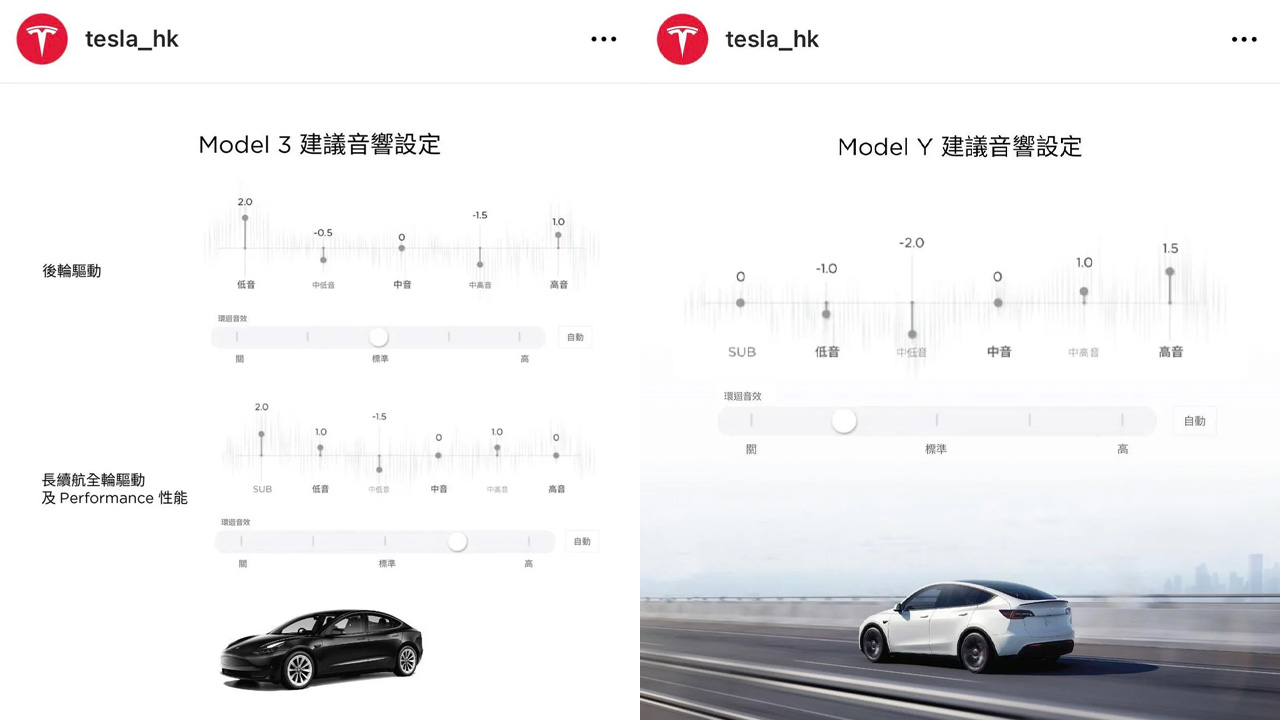 香港特斯拉曾於 Instagram 分享過建議音響設定,針對不同車型提供參考數值。不過這些設定並非全球統一標準,也不一定等同於出廠預設。整體來看,原廠調校仍以平坦 EQ 為基準,讓車主依個人聆聽習慣再進行微調。