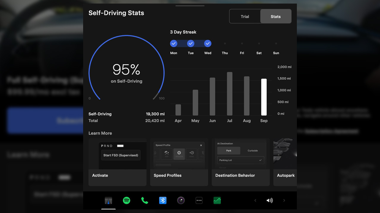 針對搭載 AI4 硬體的車型,特斯拉推出全新的 Self-Driving 應用程式。車主可在車機選單中直接開啟,完成 FSD 訂閱、觀看系統教學影片,並查看駕駛相關統計數據。