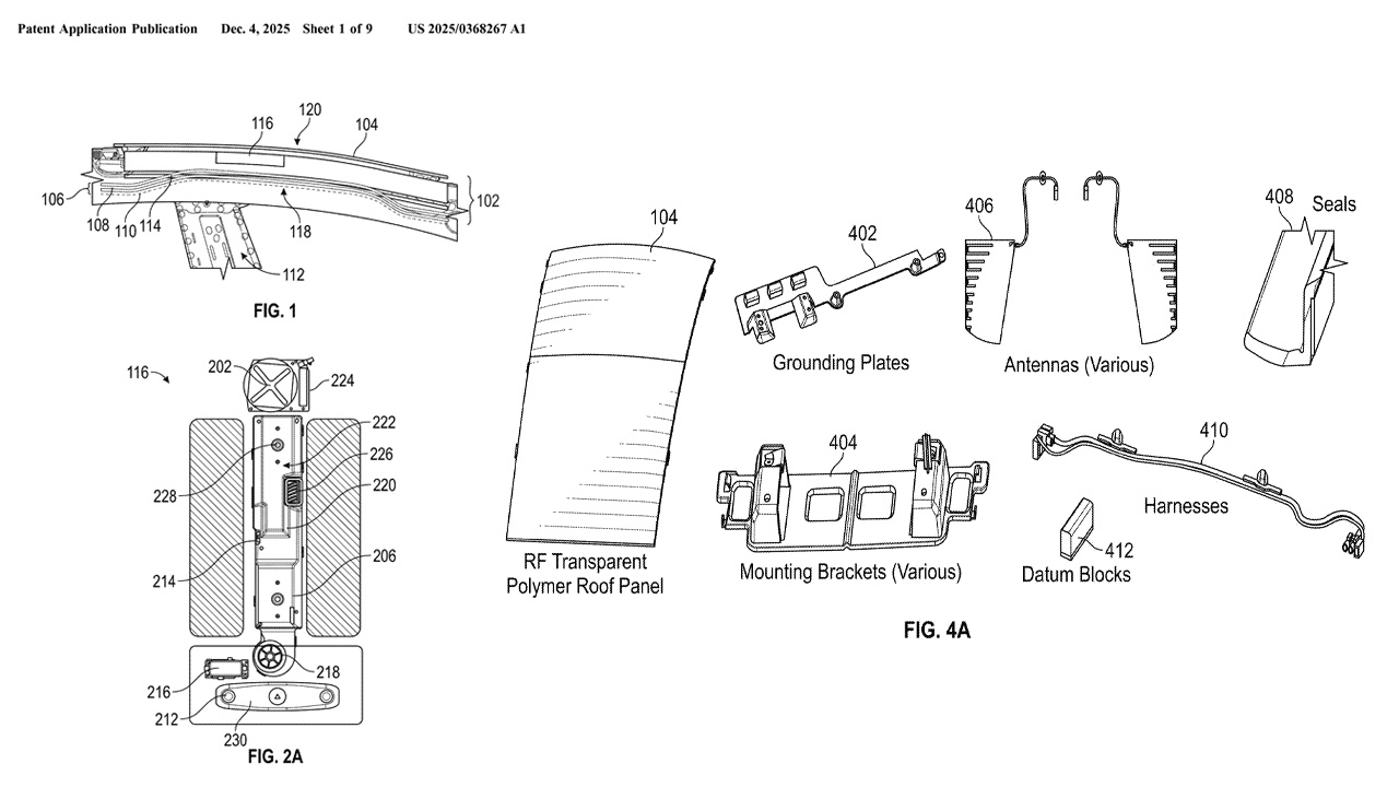 這項專利提出一種針對無線訊號友善的車頂結構設計,採用能讓射頻訊號穿透的材料來取代部分金屬板件或鍍膜玻璃。透過聚碳酸酯(PC)、ABS、ASA 等聚合物混合材質,車頂能兼顧結構強度與通訊能力,並將天線隱藏於內部,不需額外暴露於外。