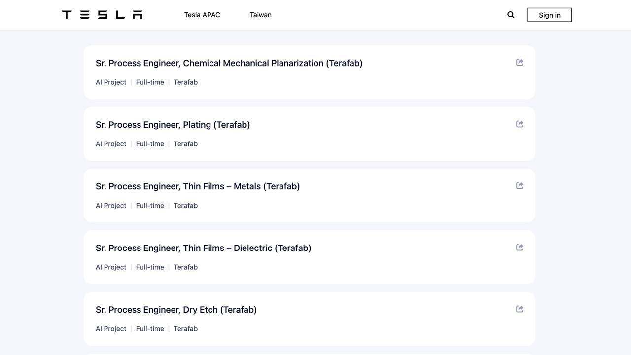 此次釋出的 9 個職缺皆隸屬於 Terafab 專案,並要求應徵者具備至少 5 年以上的先進製程經驗。從職缺分布來看,特斯拉正同步補齊晶圓製造前段與後段整合能力,逐步建立完整製程體系。