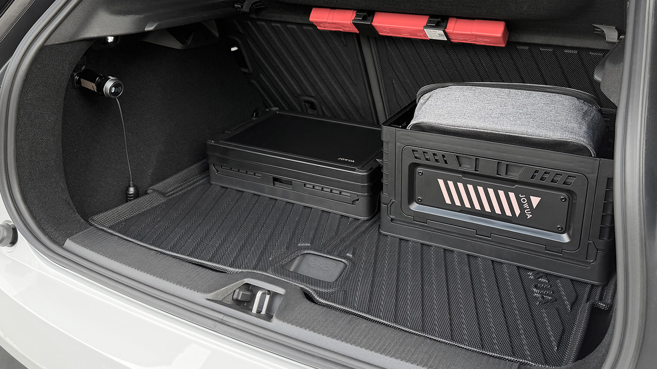 EX30 前座空間舒適,視野開闊,但後座較適合短程或孩童乘坐。後車廂雖然不大,但尺寸標示清楚,能快速判斷物品是否能放入。透過防護與收納的補強,也能讓空間使用更有彈性。